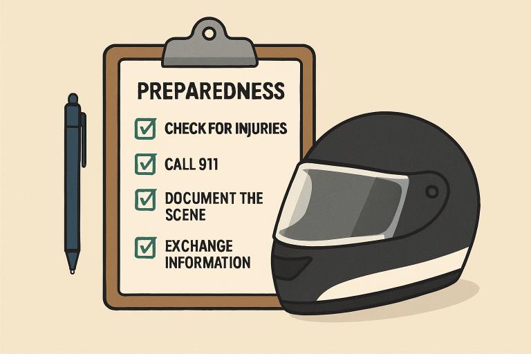 If you are physically able and it’s safe, start documenting the crash site immediately. Strong claims are built on clear, reliable evidence. Use your smartphone to photograph vehicle positions, damage, skid marks, debris, and any visible injuries. Take wide shots of the scene and close-ups of any significant details. Try to obtain the contact information of any witnesses and request their statements if possible. Hold on to your damaged helmet, jacket, gloves, and other gear—these items show the force of impact and extend your evidence beyond paperwork and photos. Preserving as much detail as possible reduces the chance of disputed facts later.